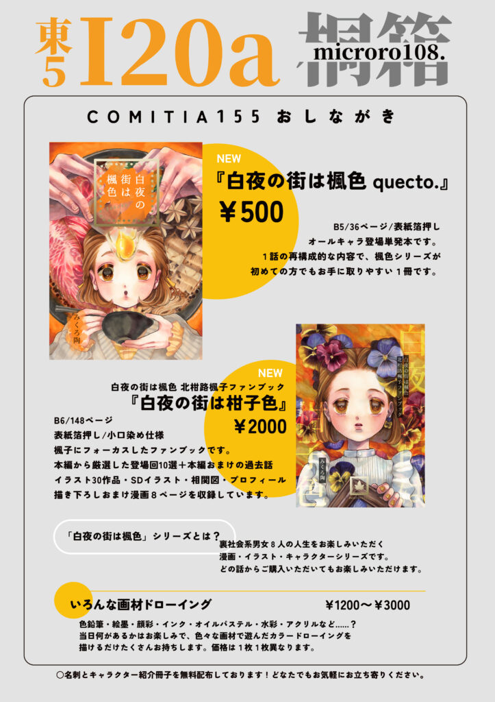 これまでの楓色本編やイラストから、私が特にそのキャラの見てほしいポイントや好きなところが詰まったものをピックアップして再収録した一冊です。(※キャラの魅力をお伝えすることを最優先しているため、ピックアップ話数の重複は存在します。楓子と朝緋で53話を両方収録する、などは予定しています。)