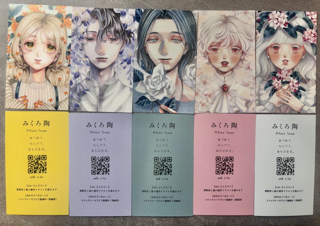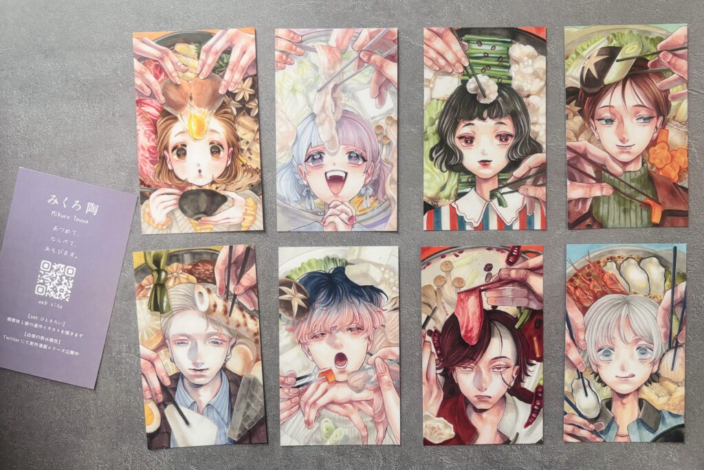 配布予定の名刺は【set:鍋】【set:樹】、またまだ届いていませんが【set:花2026】です。お好きな絵柄をぜひお持ち帰りください。